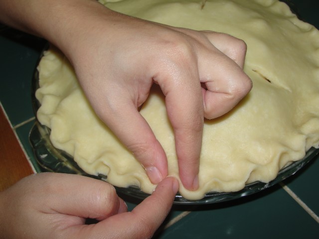 Pinch top and bottom of dough rounds firmly together then fold the edge of the top piece of dough over and under the edge of the bottom piece of dough, pressing together. Flute edges using thumb and forefinger or press with a fork.