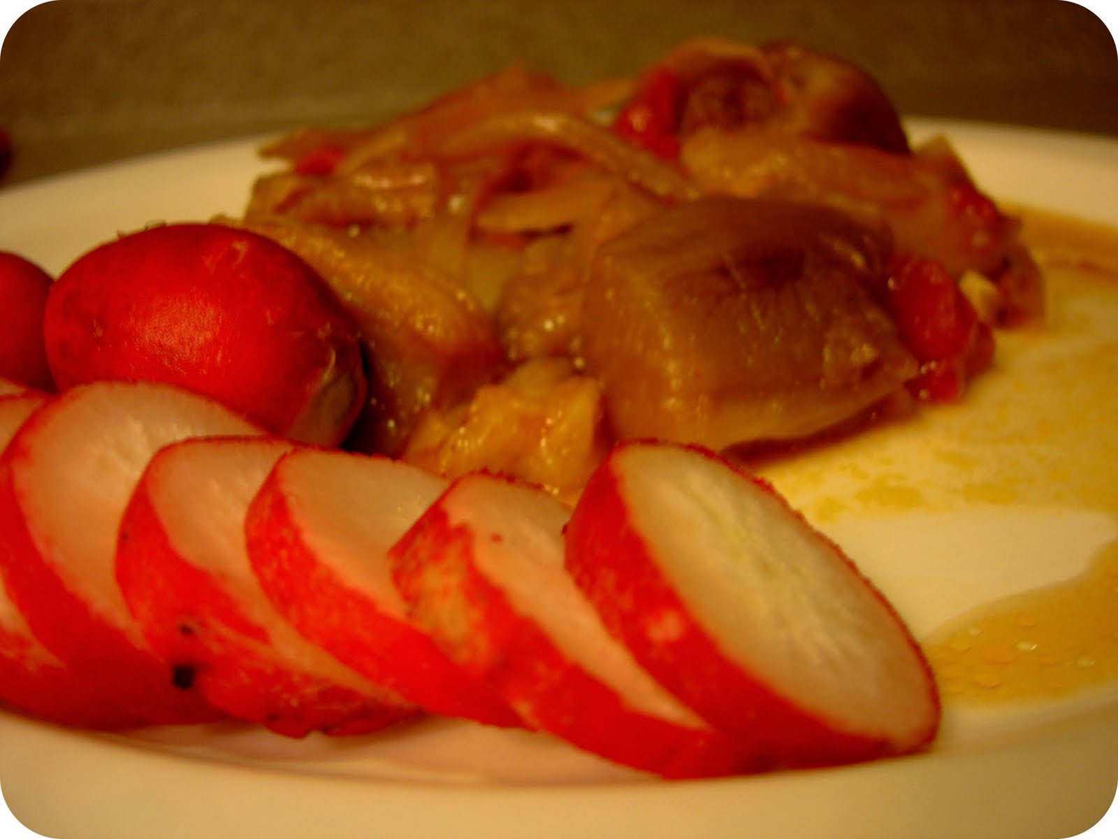 So I did this vegetarian dish the other day for dinner and my man said, “no way I’m gonna eat it, it’s eggplant and radishes!”  I just asked him to have one bite for me, so he agreed and he kept on going bite after bite saying it’s not bad- then it’s not bad at all, hhmmmm the radish is so tasty with it….