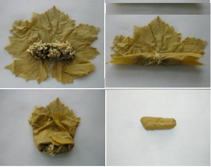 – Take a spoonful of the beef and rice and place on one grape leave. Then, wrap the grape leave, making sure that it fully wraps so that no rice or chop meat will fall out. Do this with each grape leaf.