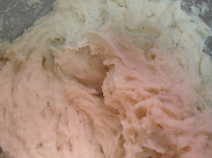 Heat the water with chicken bouillon. Once it starts boiling, turn off the flame and add the flour while continuously stirring until you get sticky dough. Put on the side and let it cool well