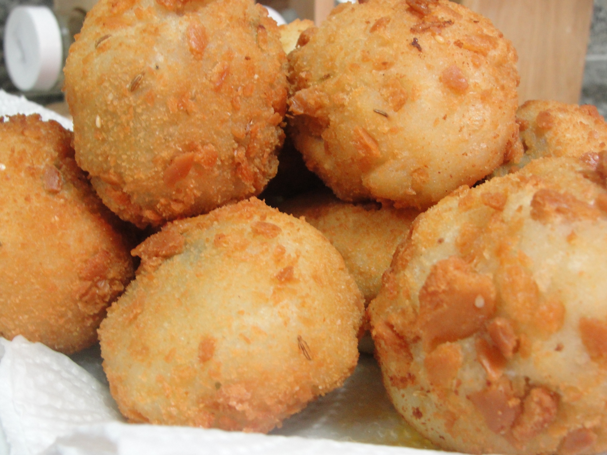 Close the dough around the filling and shape into a ball. Dip the dumpling in milk then bread crumbs.