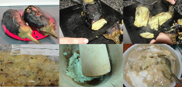 Bake the eggplant for about 35 minutes then let it rest till it cools down and then peel it.