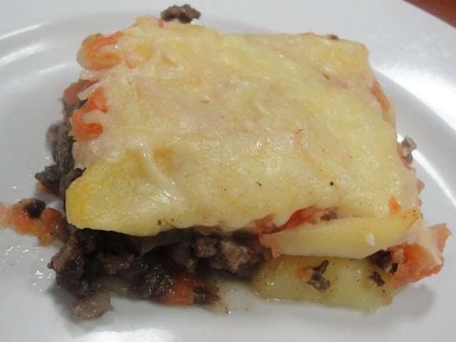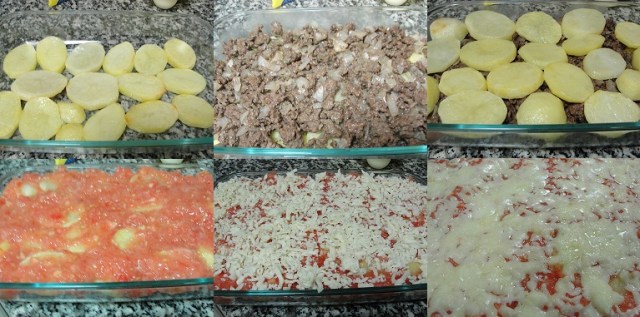 Spread half of the potatoes in a baking dish. Top it with beef; spread remaining potatoes over the beef. Pour the tomato sauce over the potatoes.
