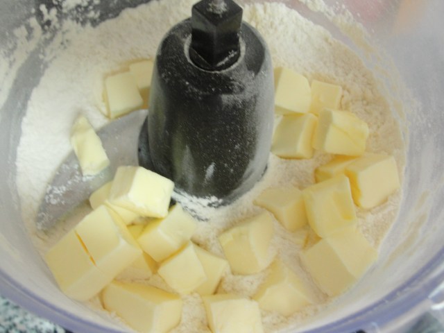 Using a food processor, add the flour, the sugar, salt and frozen butter and pulse short pulses for about 6 to 8 pulses