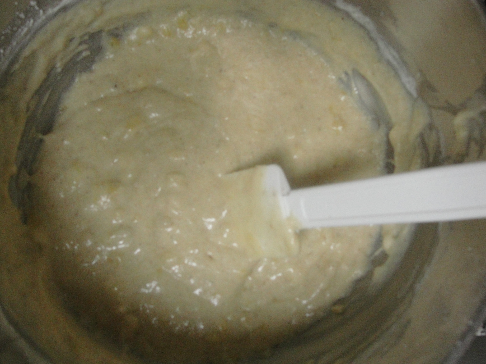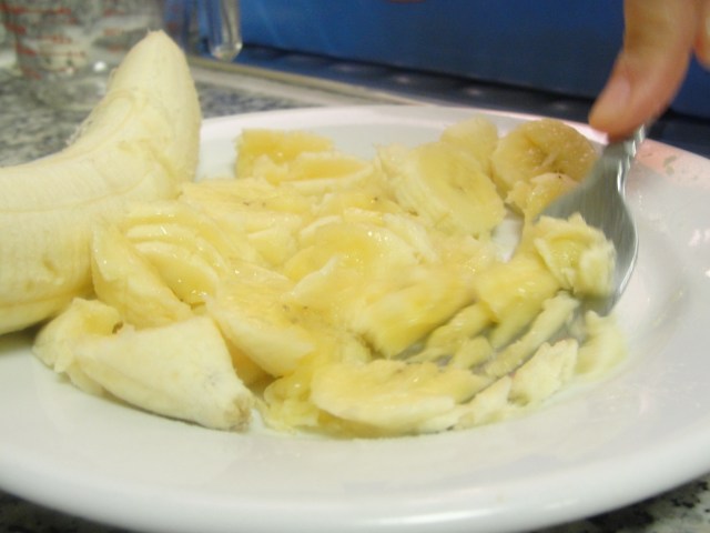 Cut the bananas and mush them, adding them to the mixer and let it run for a minute or so until they are well mixed.
