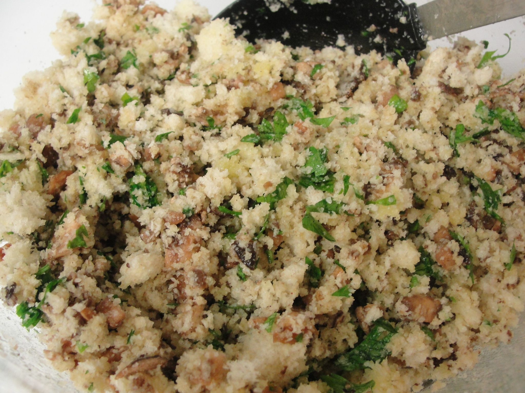 Take the skins of the bread and chop finely using a food processor or a knife.