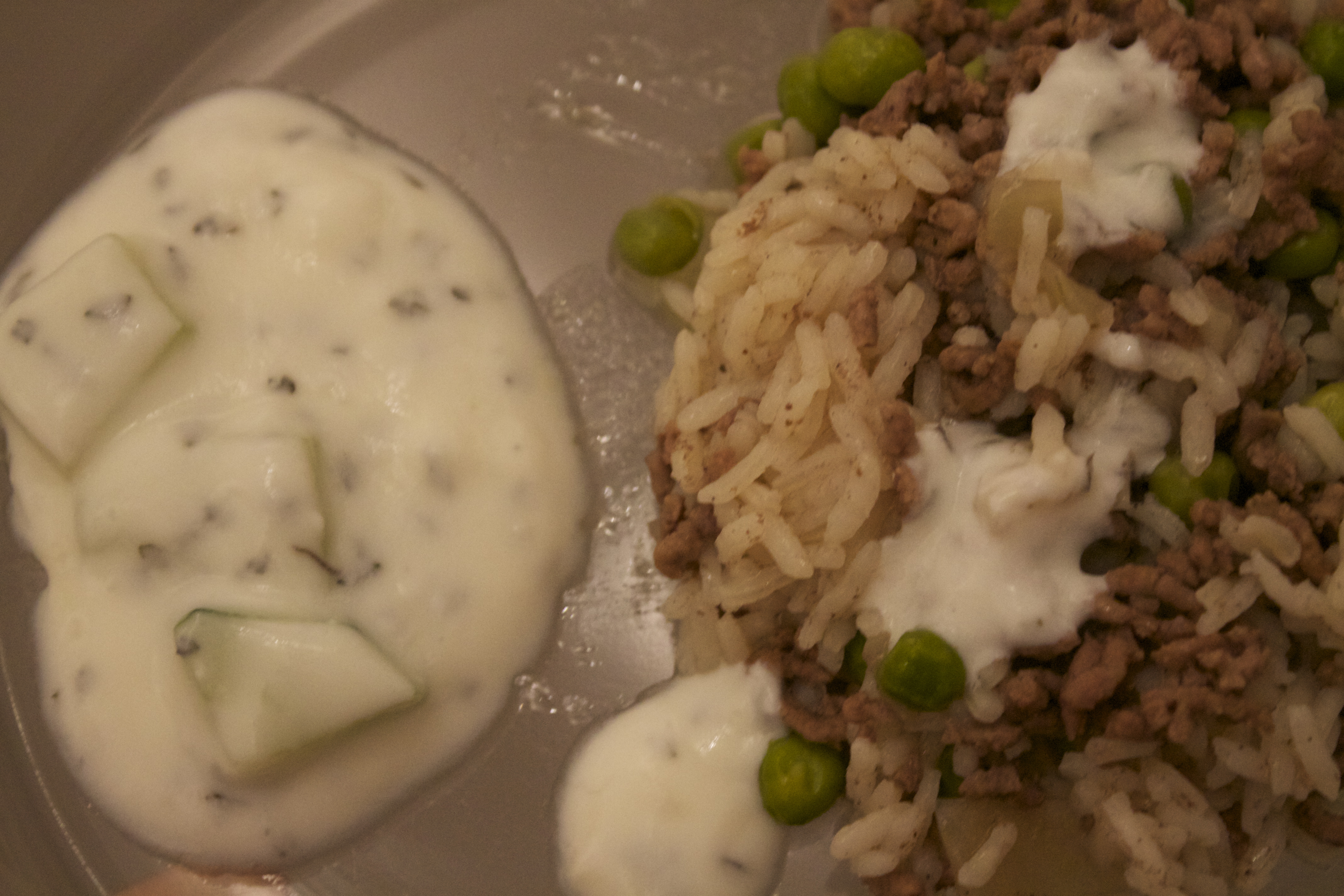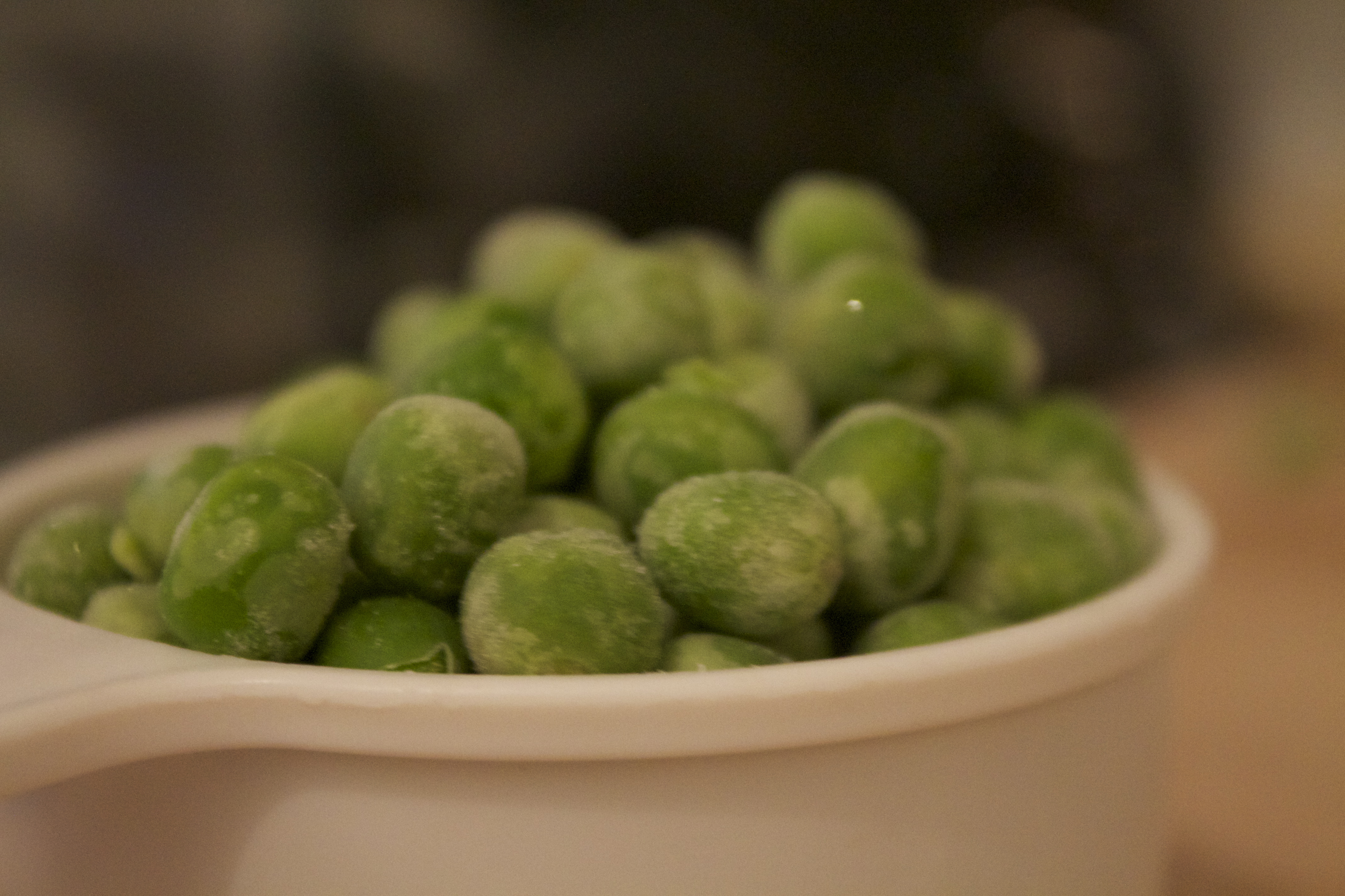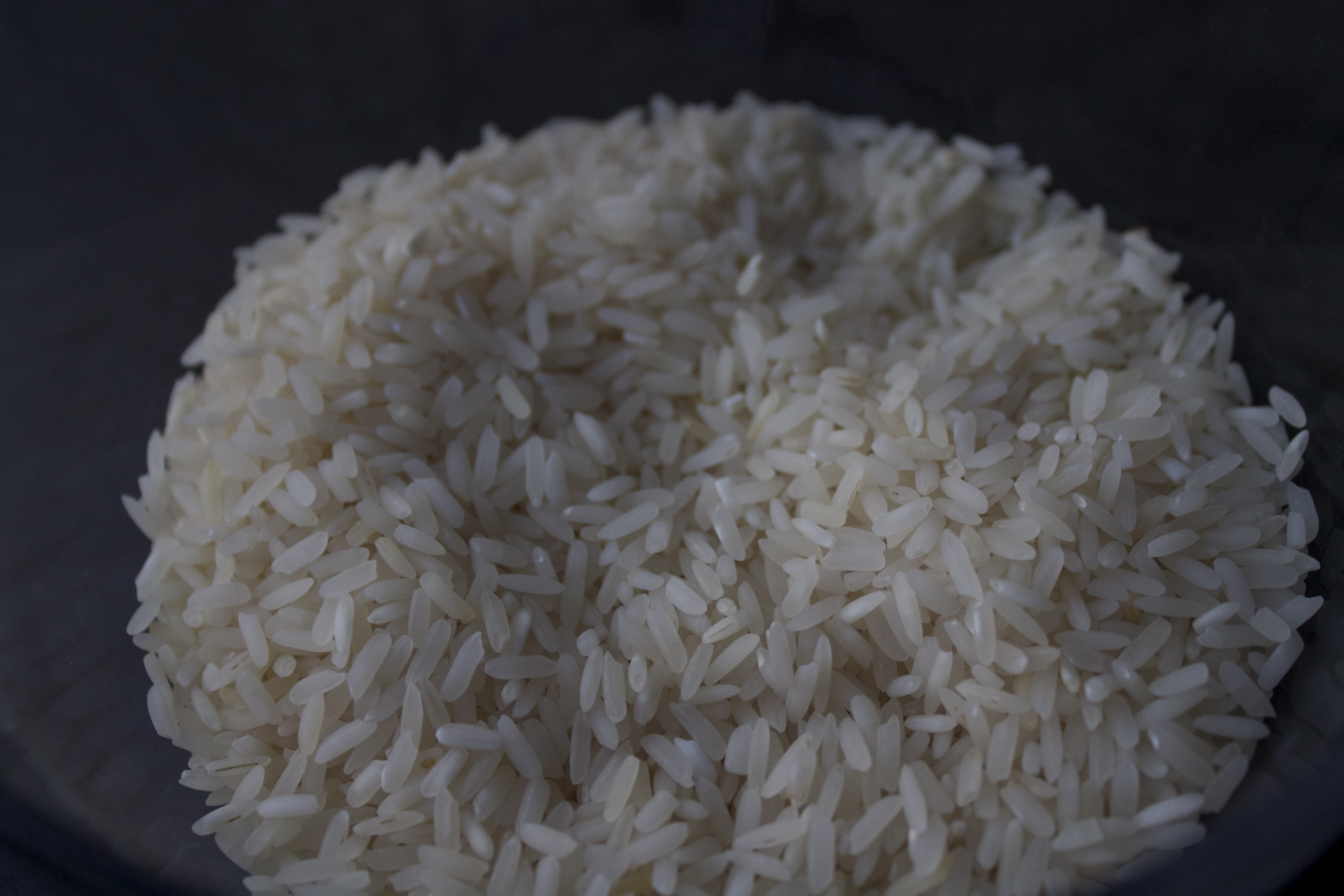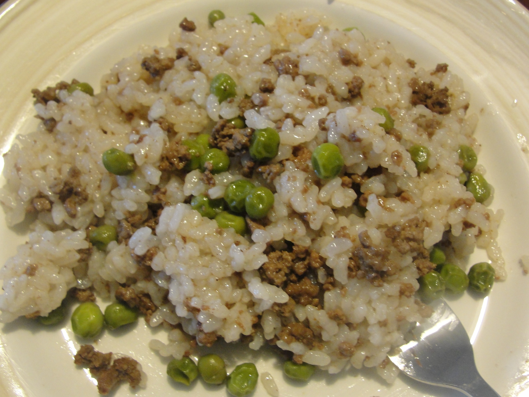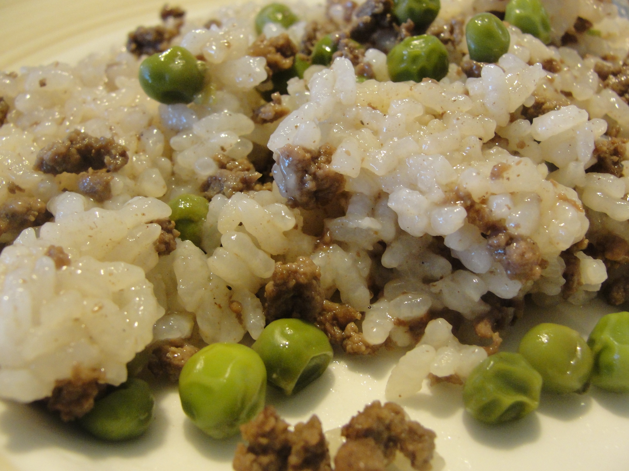 Add the rice and 2 cups of water to the meat and peas, then add 2 tbsp of chicken stock (or one cube of chicken bullion).