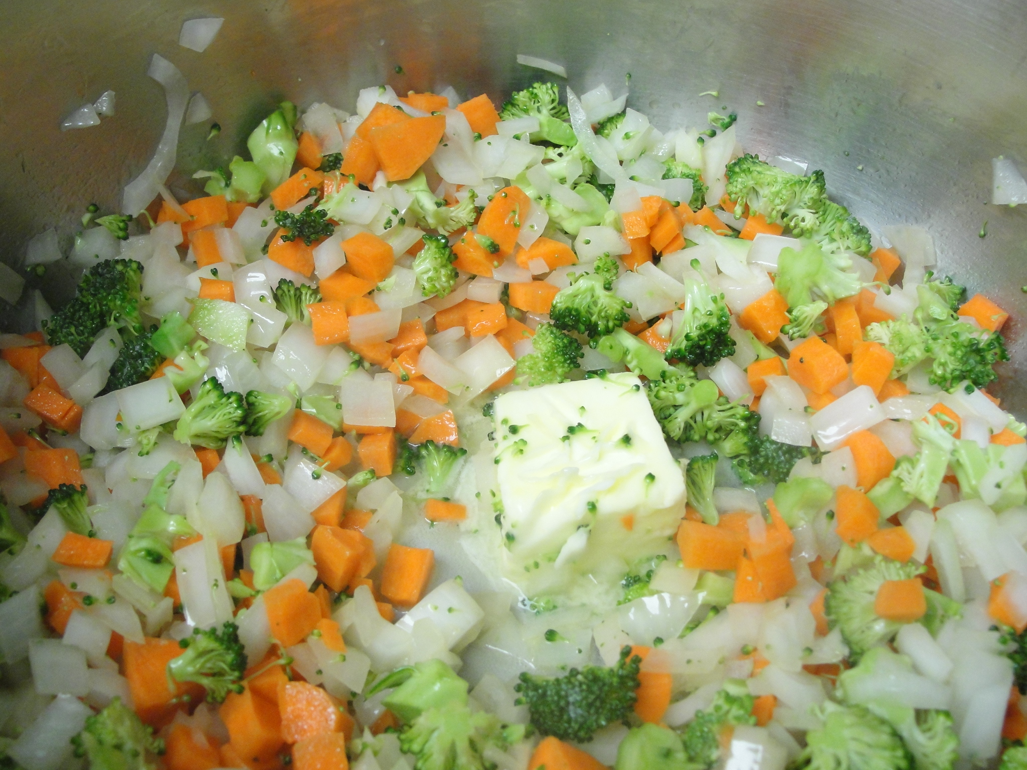 Cook the butter and the diced vegetables on a low flame until all the vegetables get soft. This should take about 5 to 7 minutes.