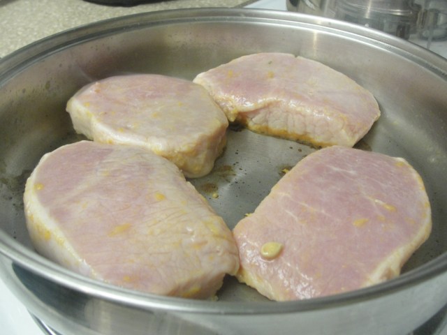 Heat the skillet on the stove for 4 minutes then cook the pork chops for 4 minutes on each side.