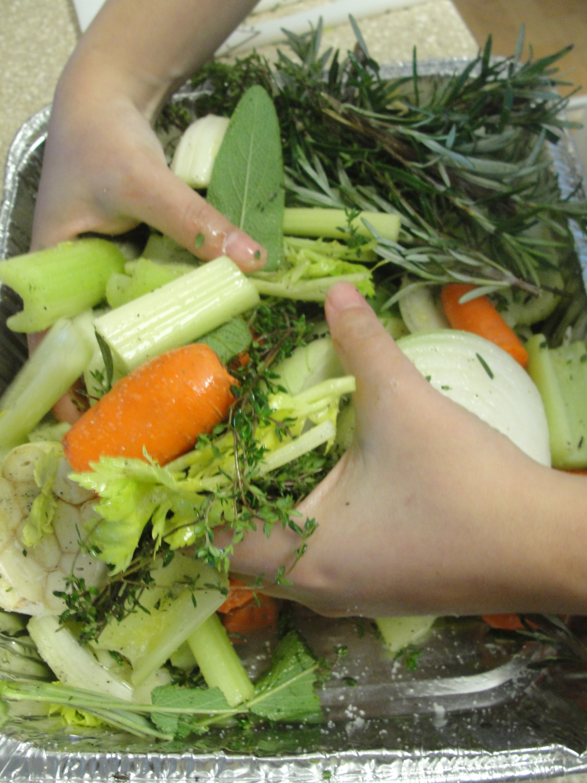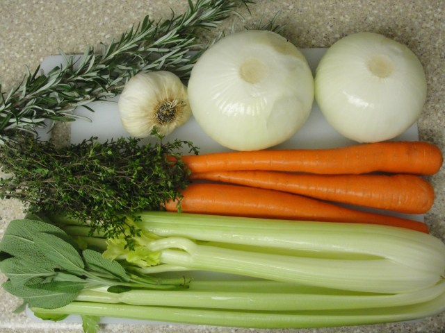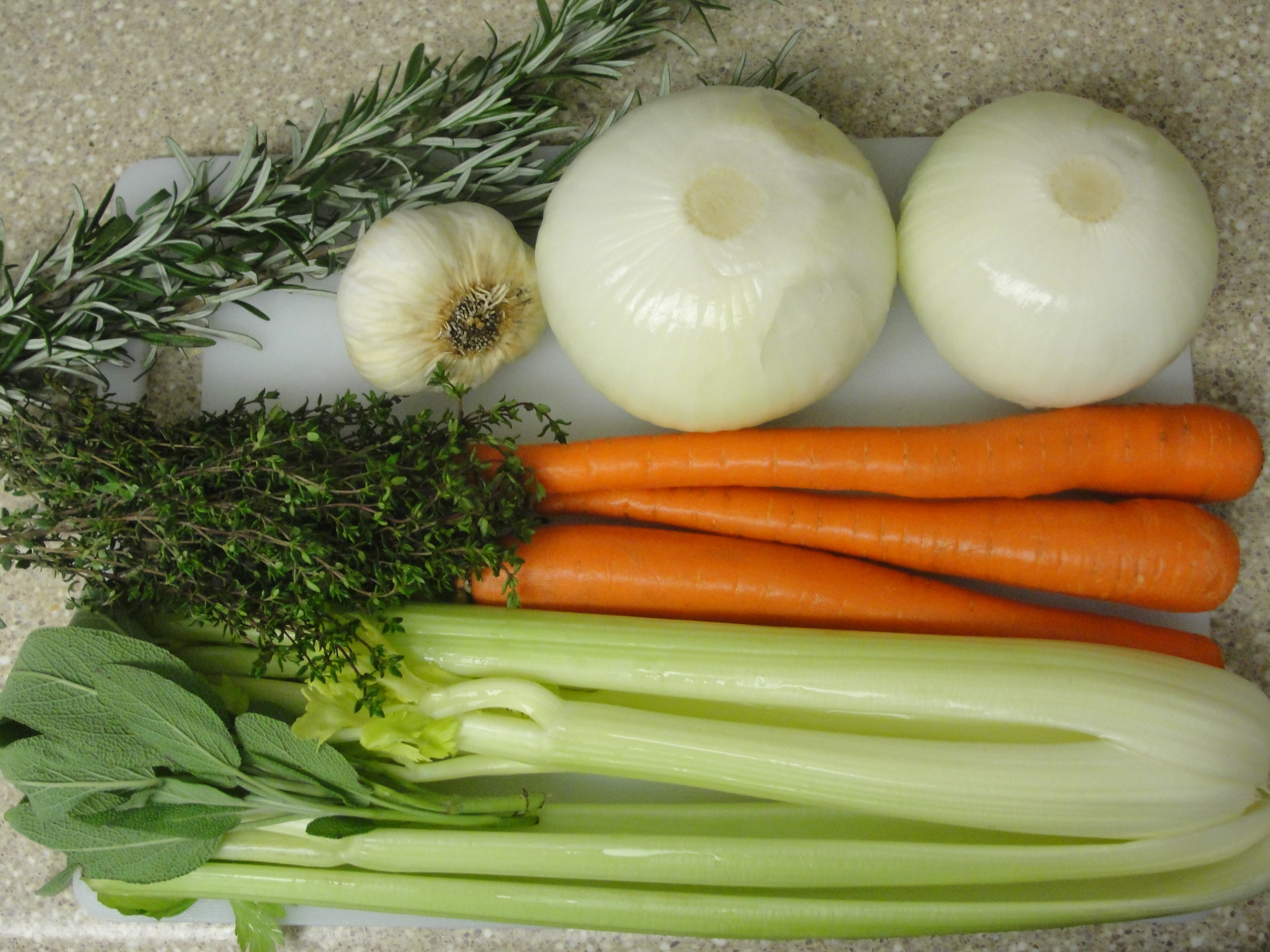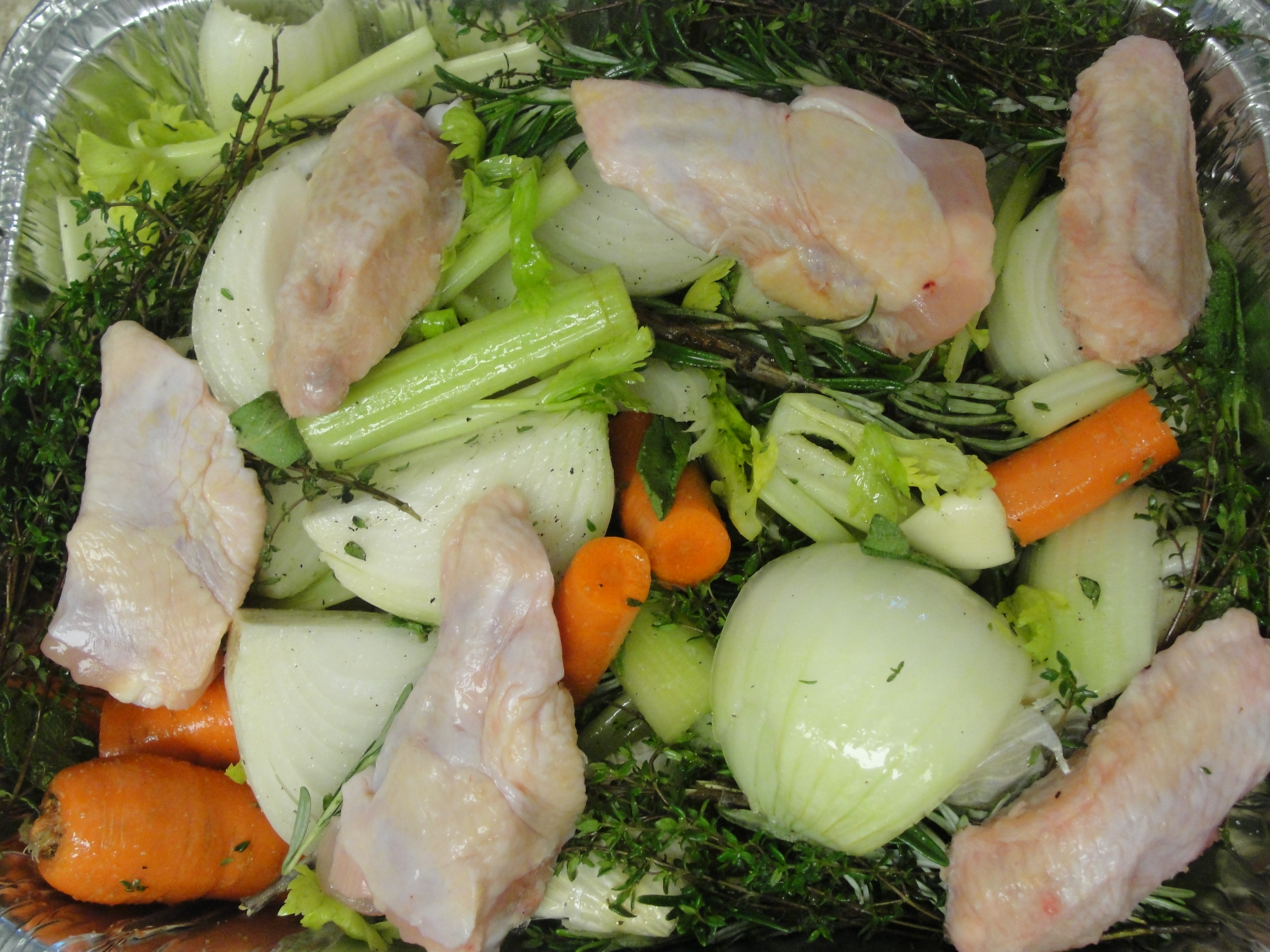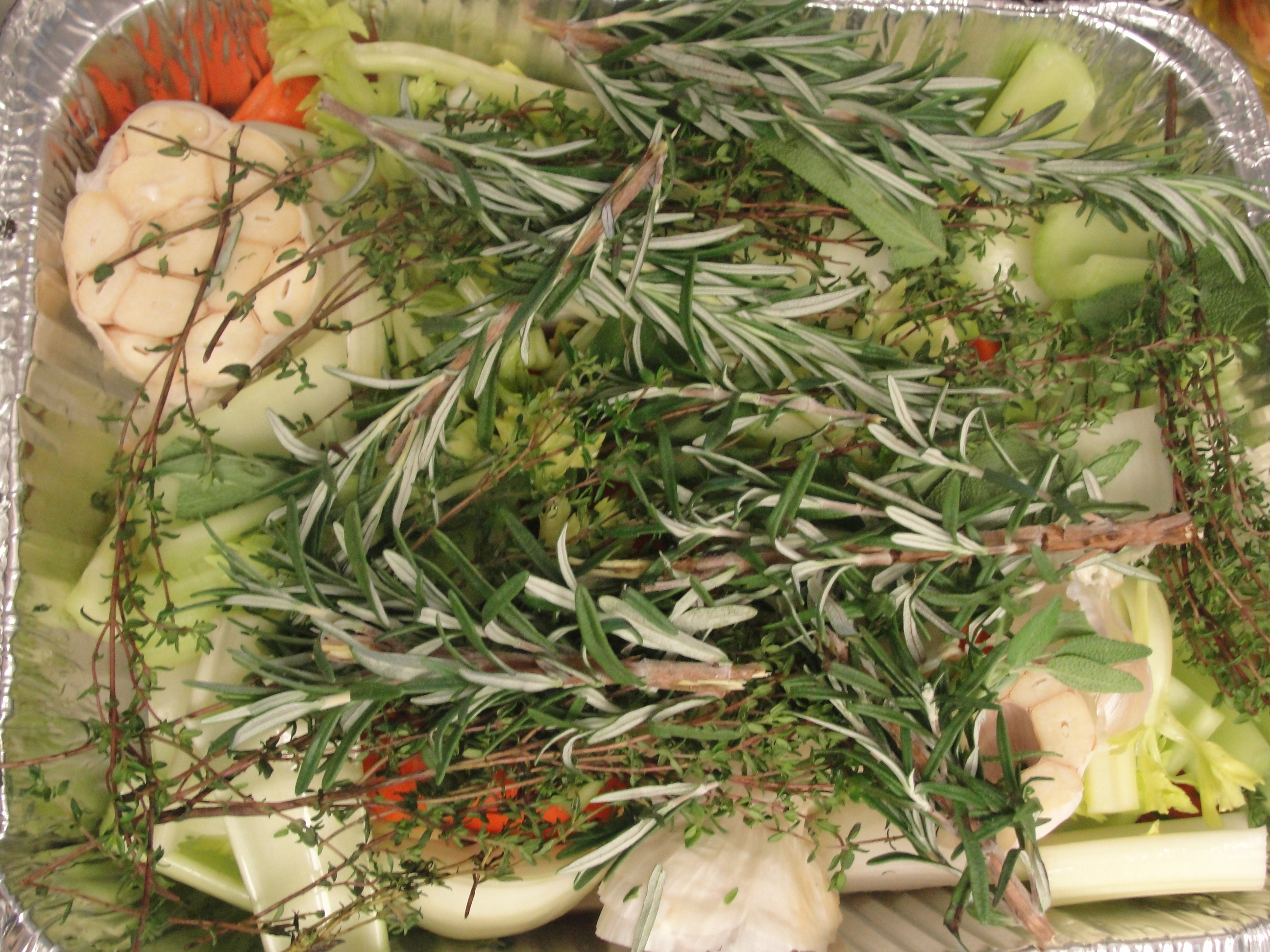 Cut the onion, celery, carrots and garlic and place at the bottom of the tray with the herbs.