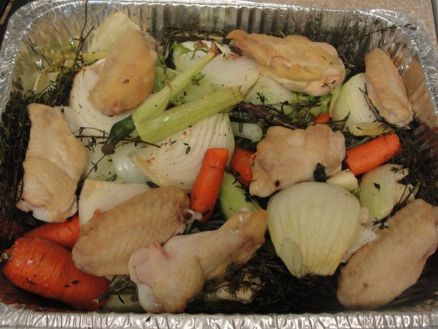After 45 minutes, add the white wine and the chicken stock to the tray and put back in the oven for another 45 minutes or when the liquid has reduced about half.