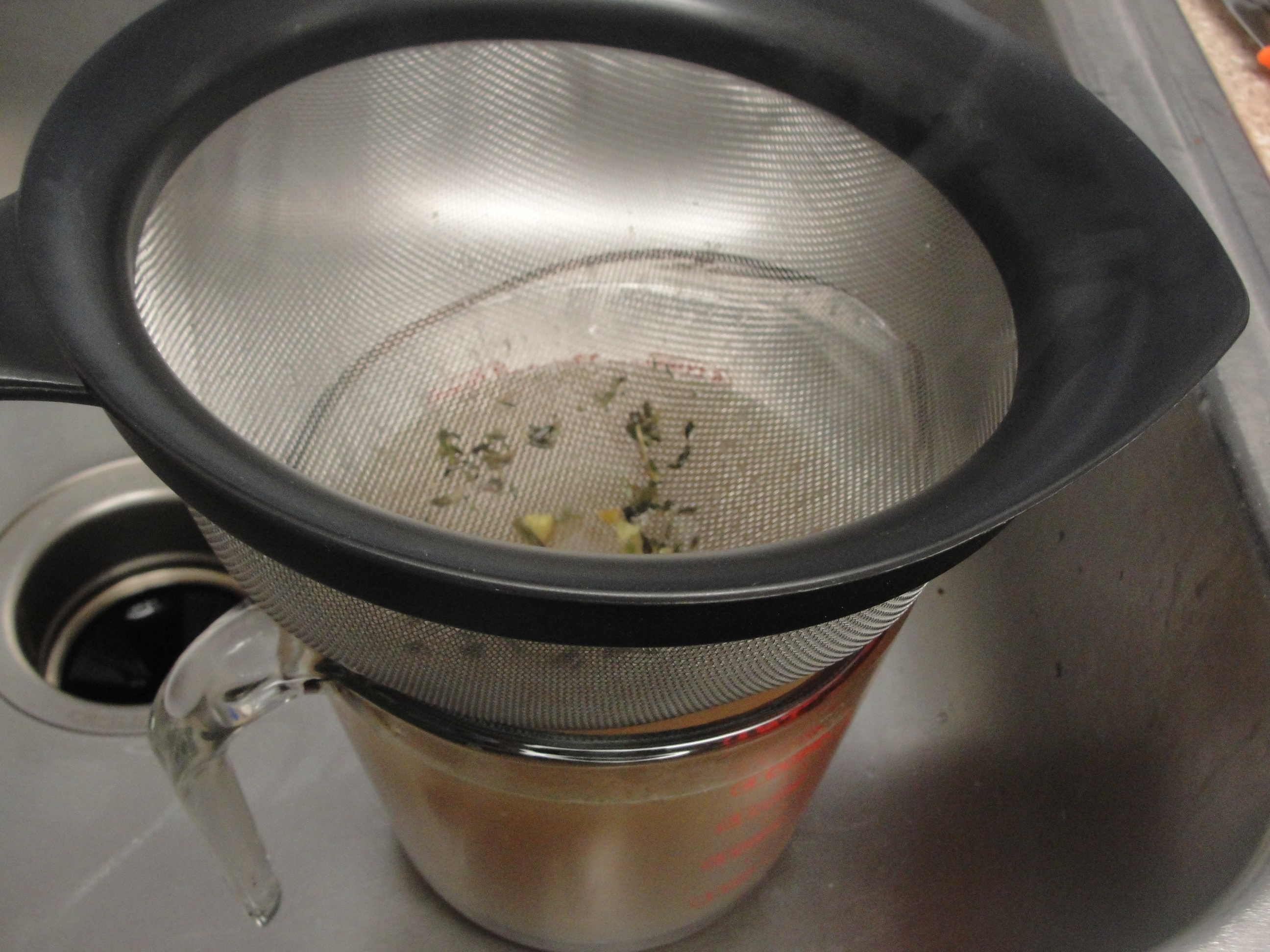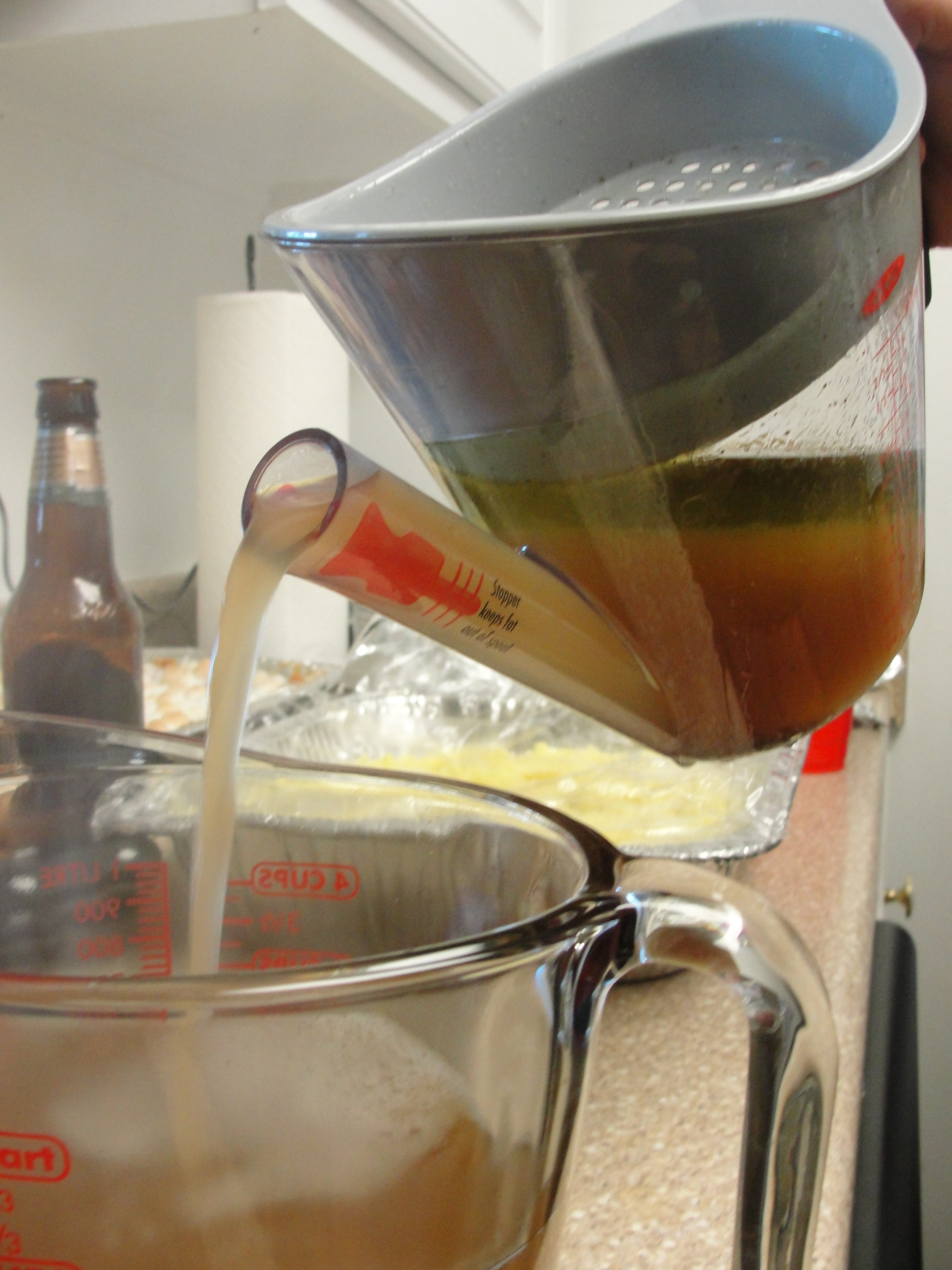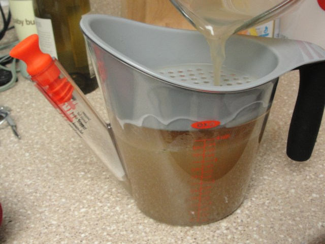 Take out of the oven and strain the liquid. Then put in a gravy separator to separate the fat.