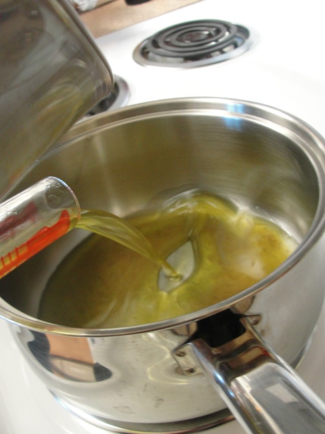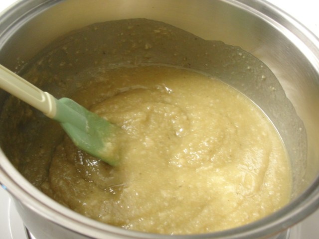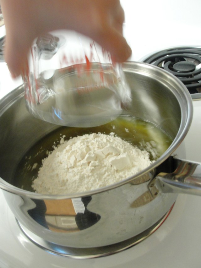 In a pot, add the fat and the flour and mix together on a medium heat until well combined for about 3 minutes.