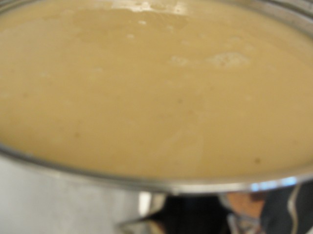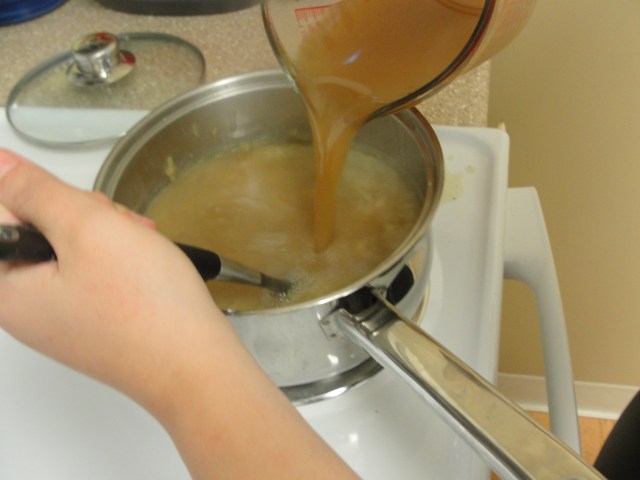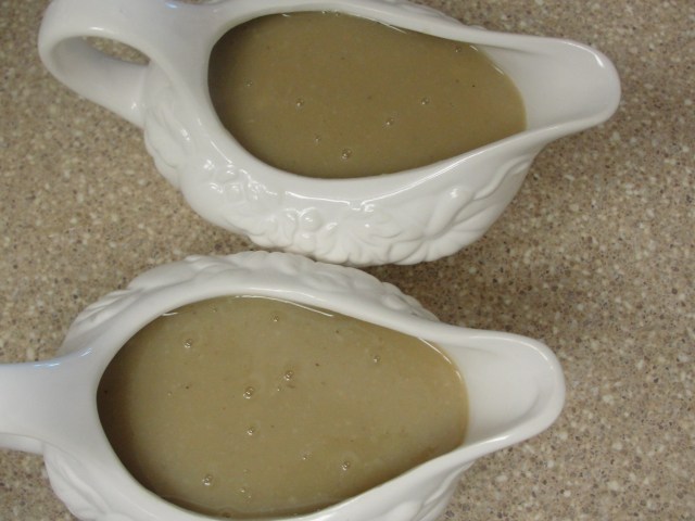 Whisk the chicken stock that was prepared and the juices that were strained from the turkey slowly with the flour/fat mixture.