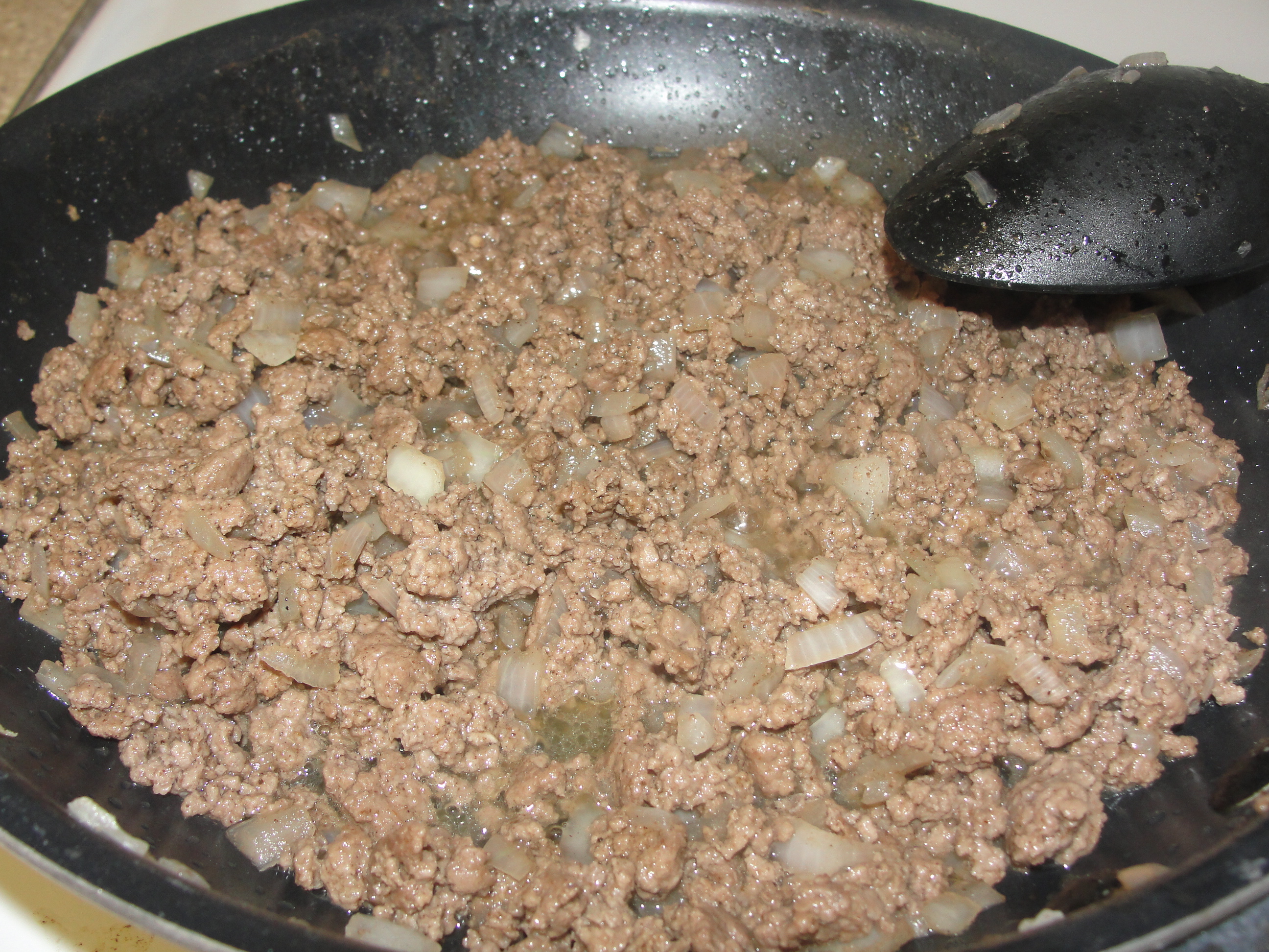 Using a saucepan, fry the onion until it is golden yellow then add the ground beef and cook until brown.