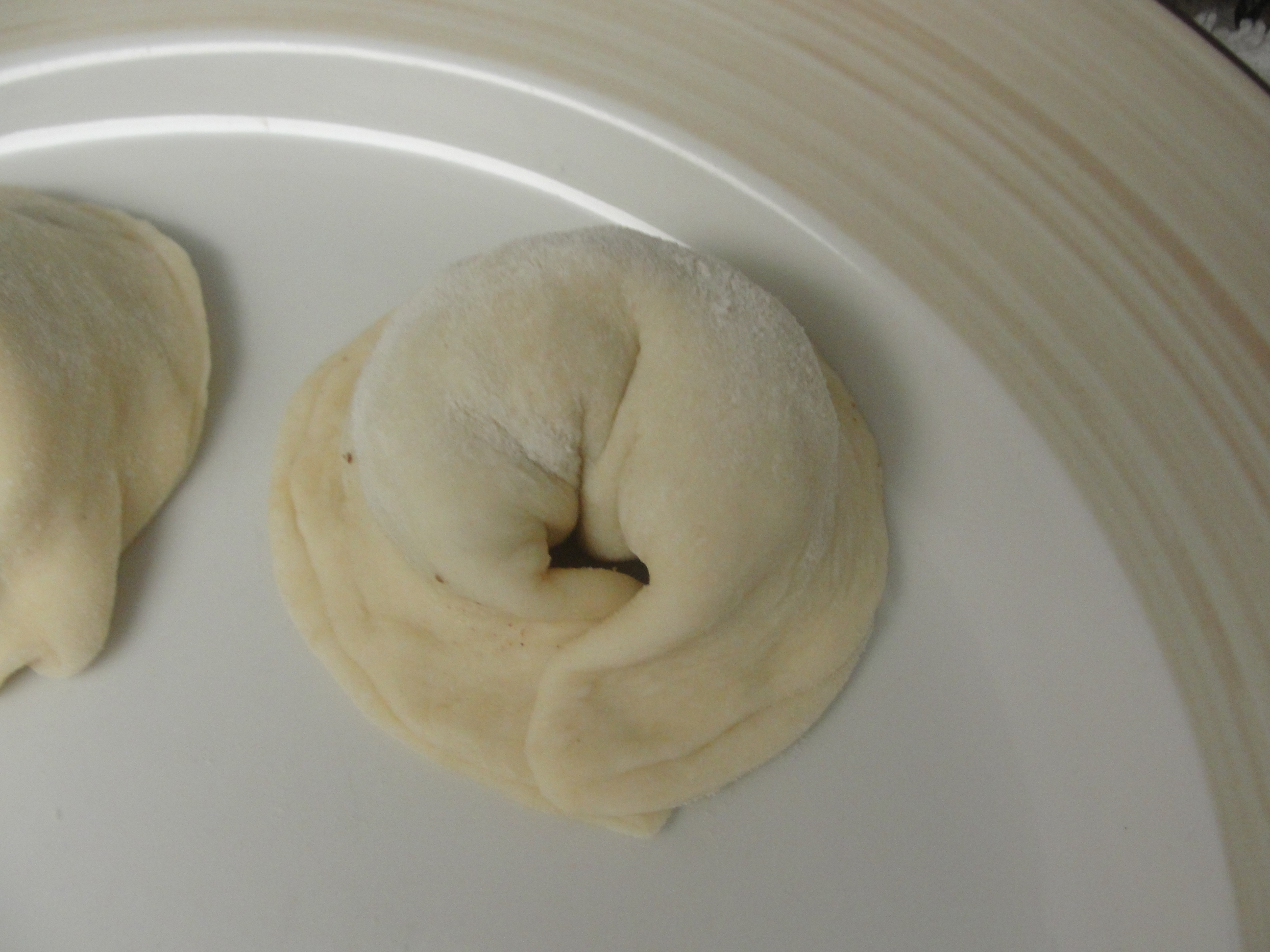 Put one teaspoon of the meat in the dough and roll it into a half-circle shape and press well on the edges to close, then bring the far ends together and press well till they get stuck together (as shown in the picture).