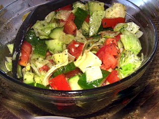 Cut the tomato, the cucumber and the lettuce into small one inch squares, and place them in a salad bowl.