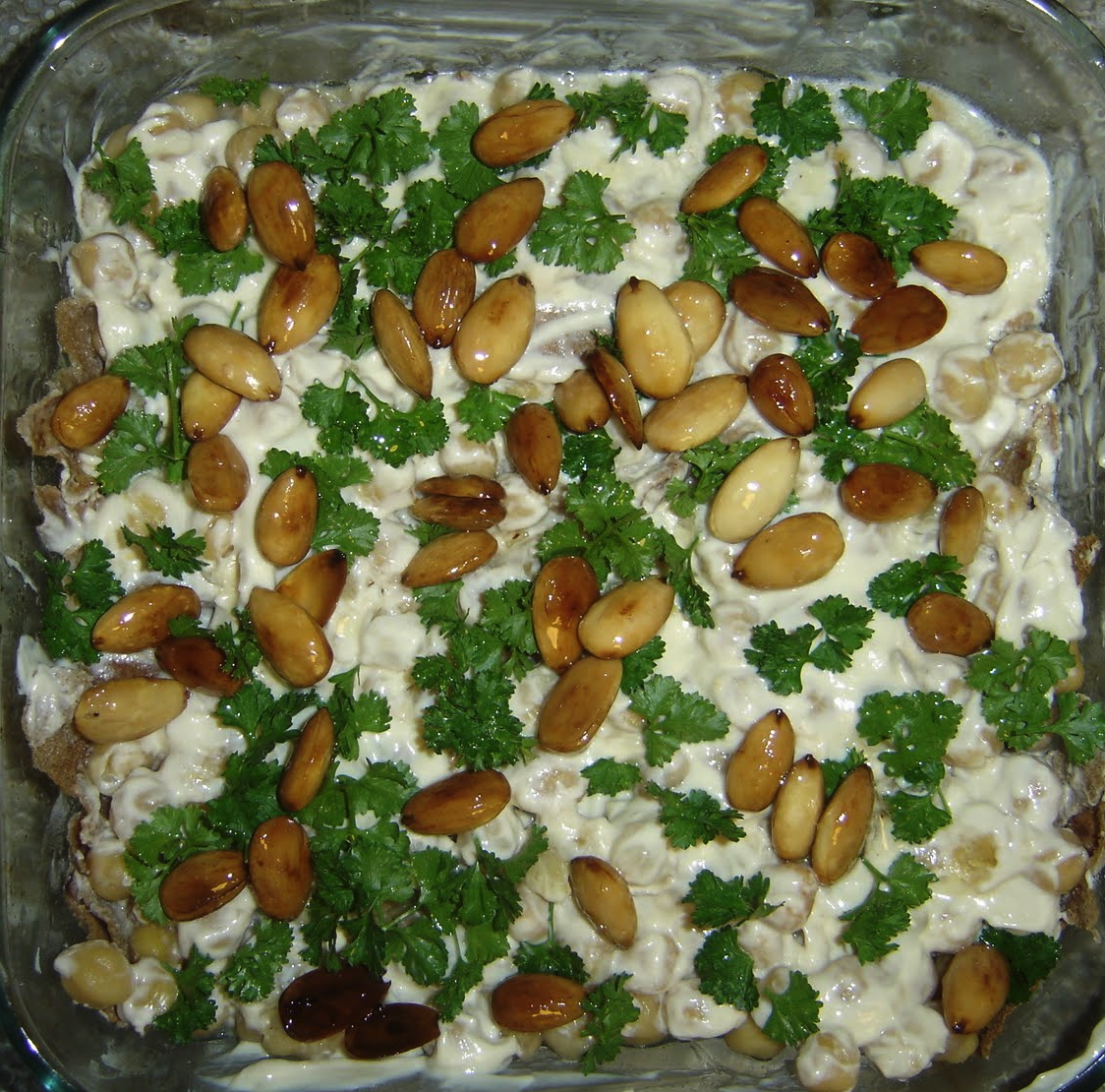 Using a sauce pan, fry the almonds or the pine nuts in sizzling butter until they are golden brown and add it on top of the tahini sauce.