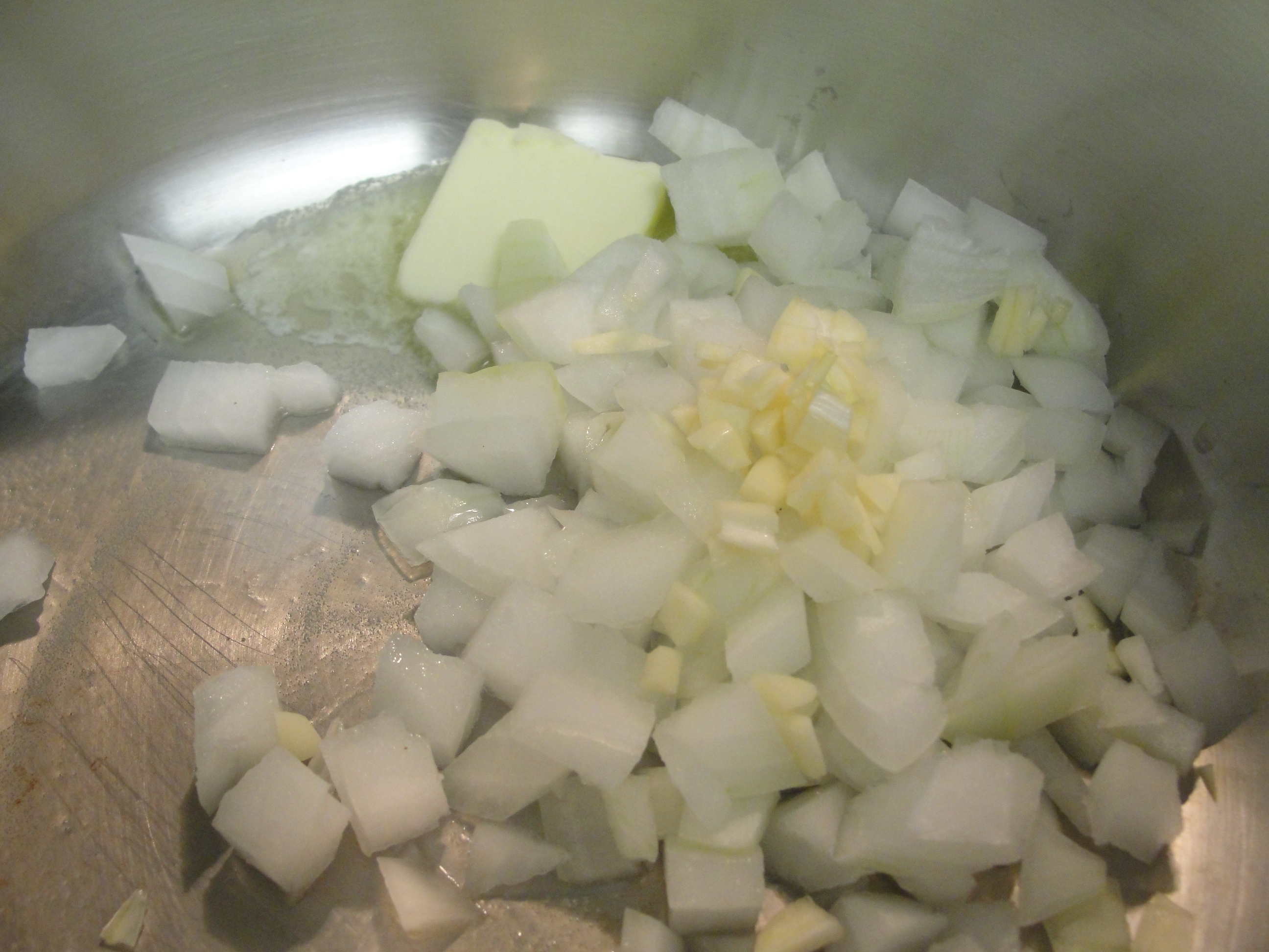 Dice the onion and garlic and sauté in one table spoon of butter until soft.