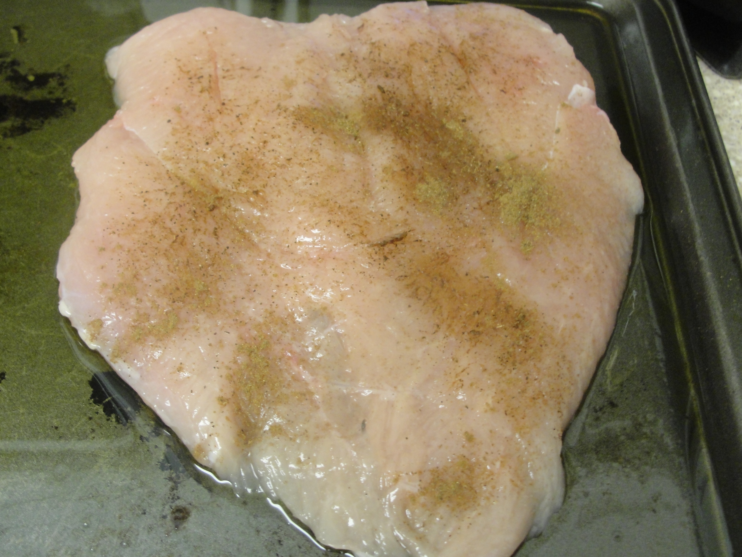 Cut the chicken breast vertically in half and beat a bit to get thinner but not much so it doesn’t rip off.