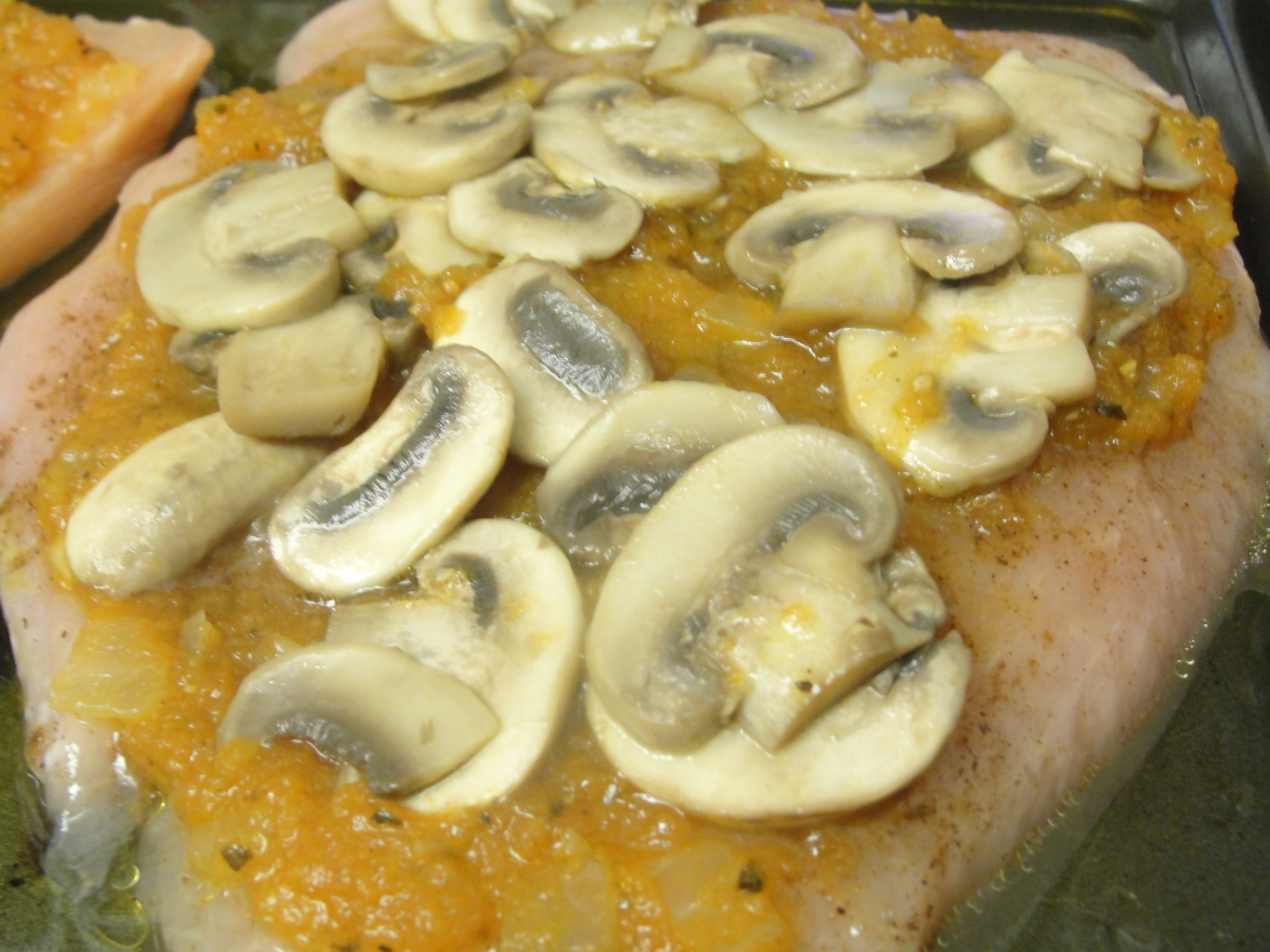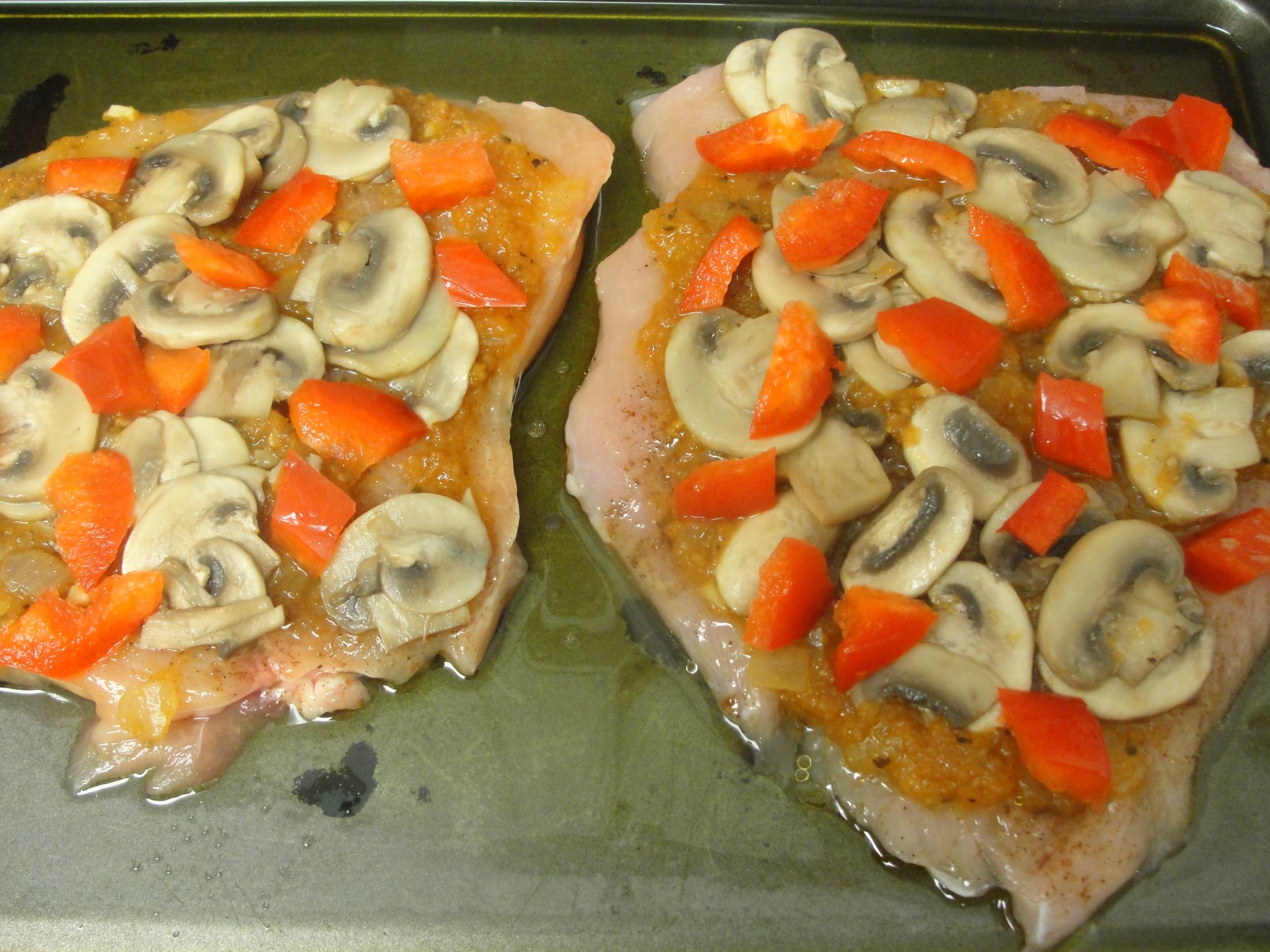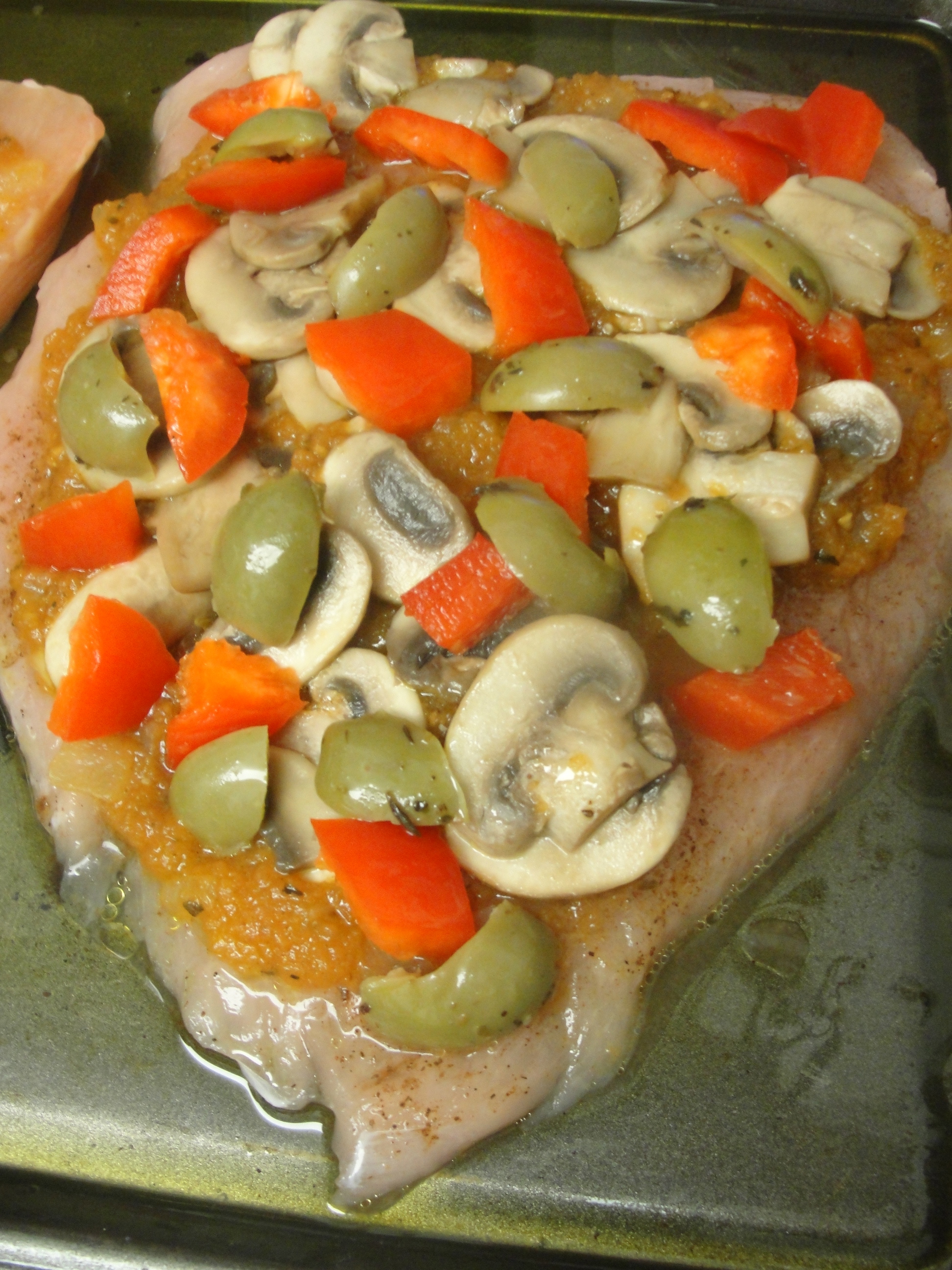 Put some of the sauce on top of the chicken breast then spread some mushrooms and top it with some sweet red pepper and olive.