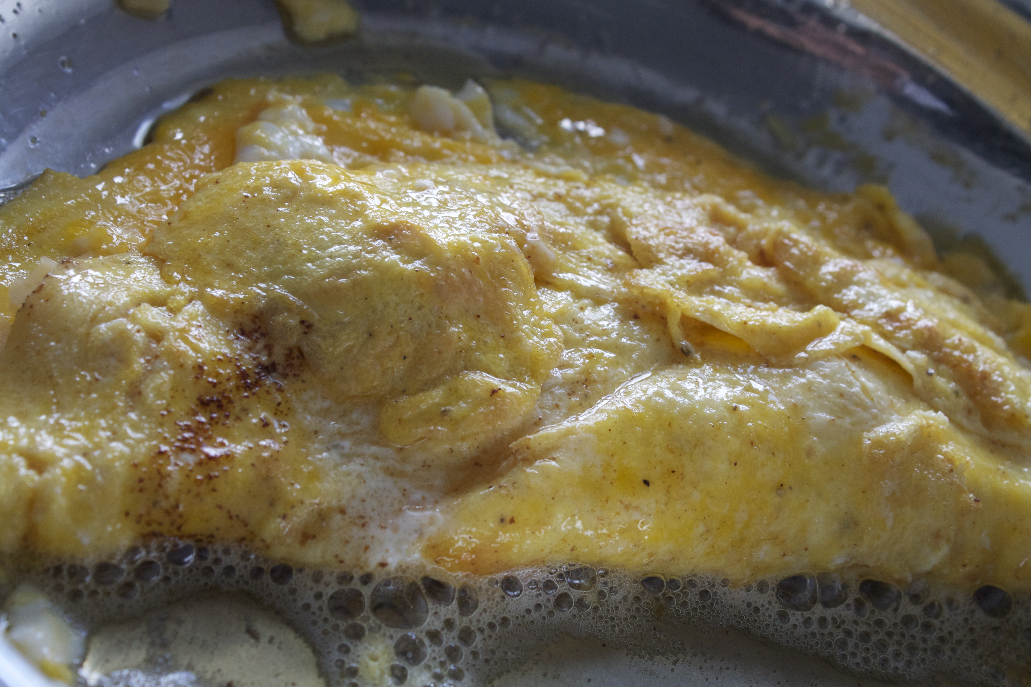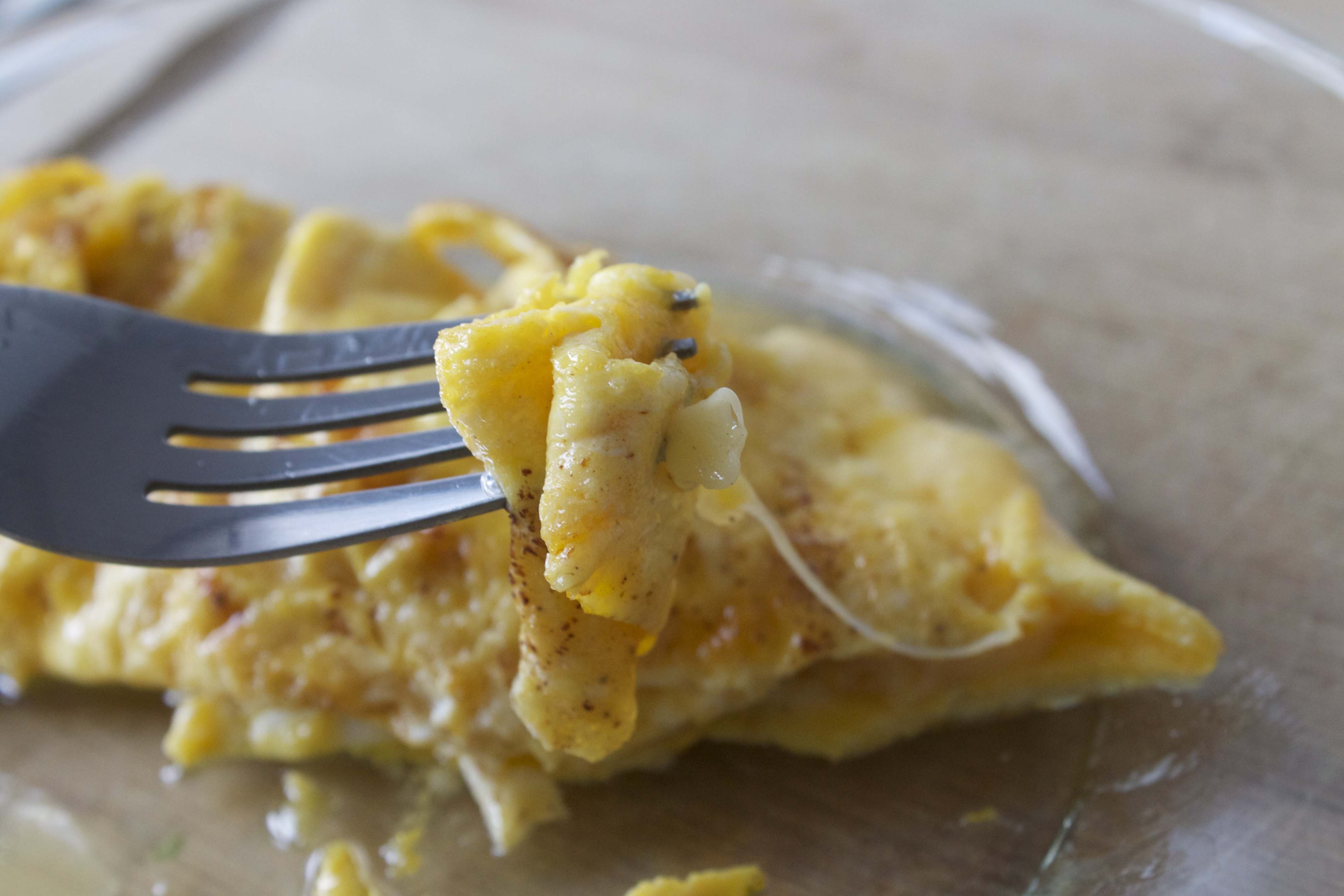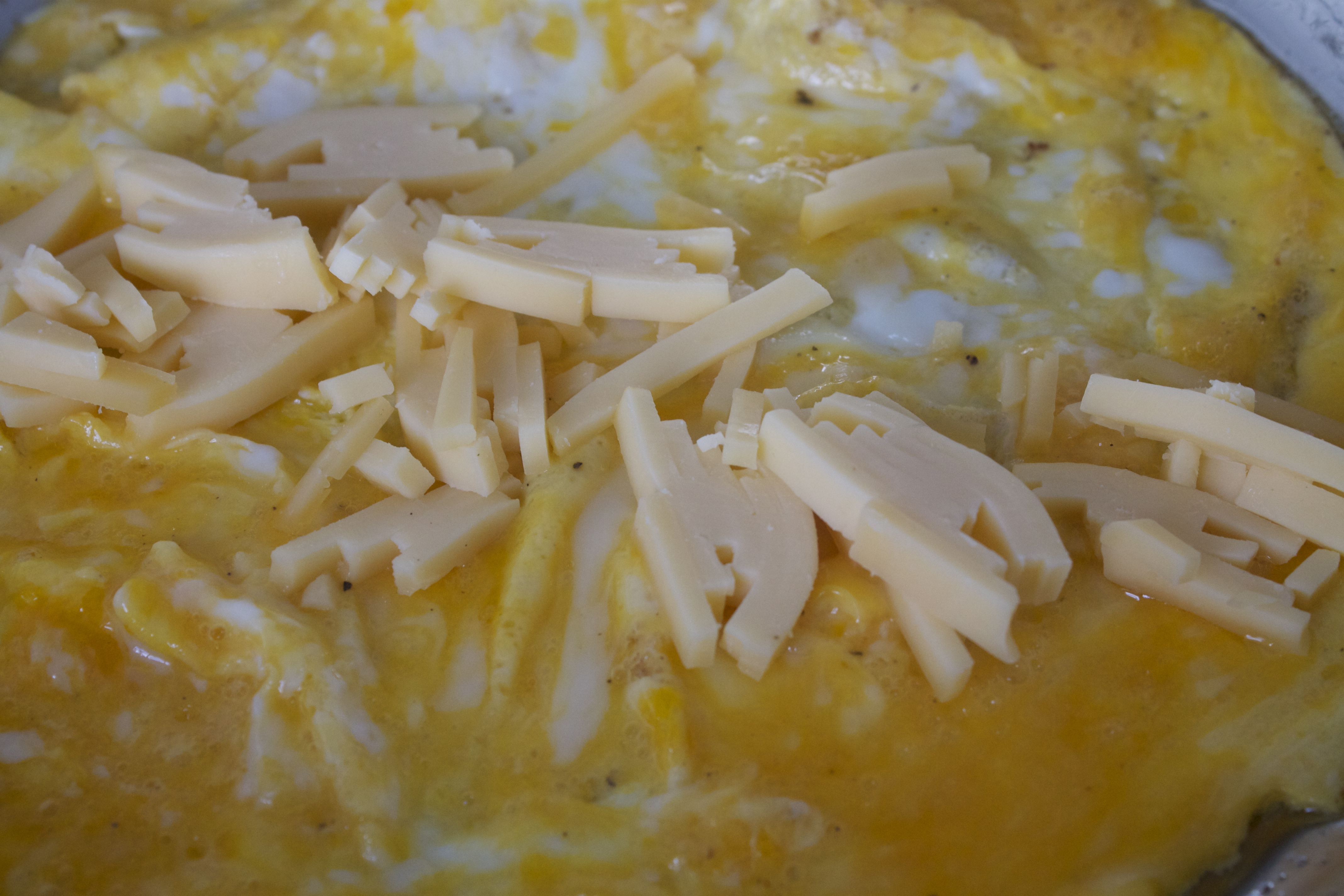 Start to move the sides to the center and tilt the pan so it spreads out. When its 80 % done, put the cheeses in the middle and, using a spatula, fold it over in half.   Leave it for a minute in the pan and then put it on a plate.