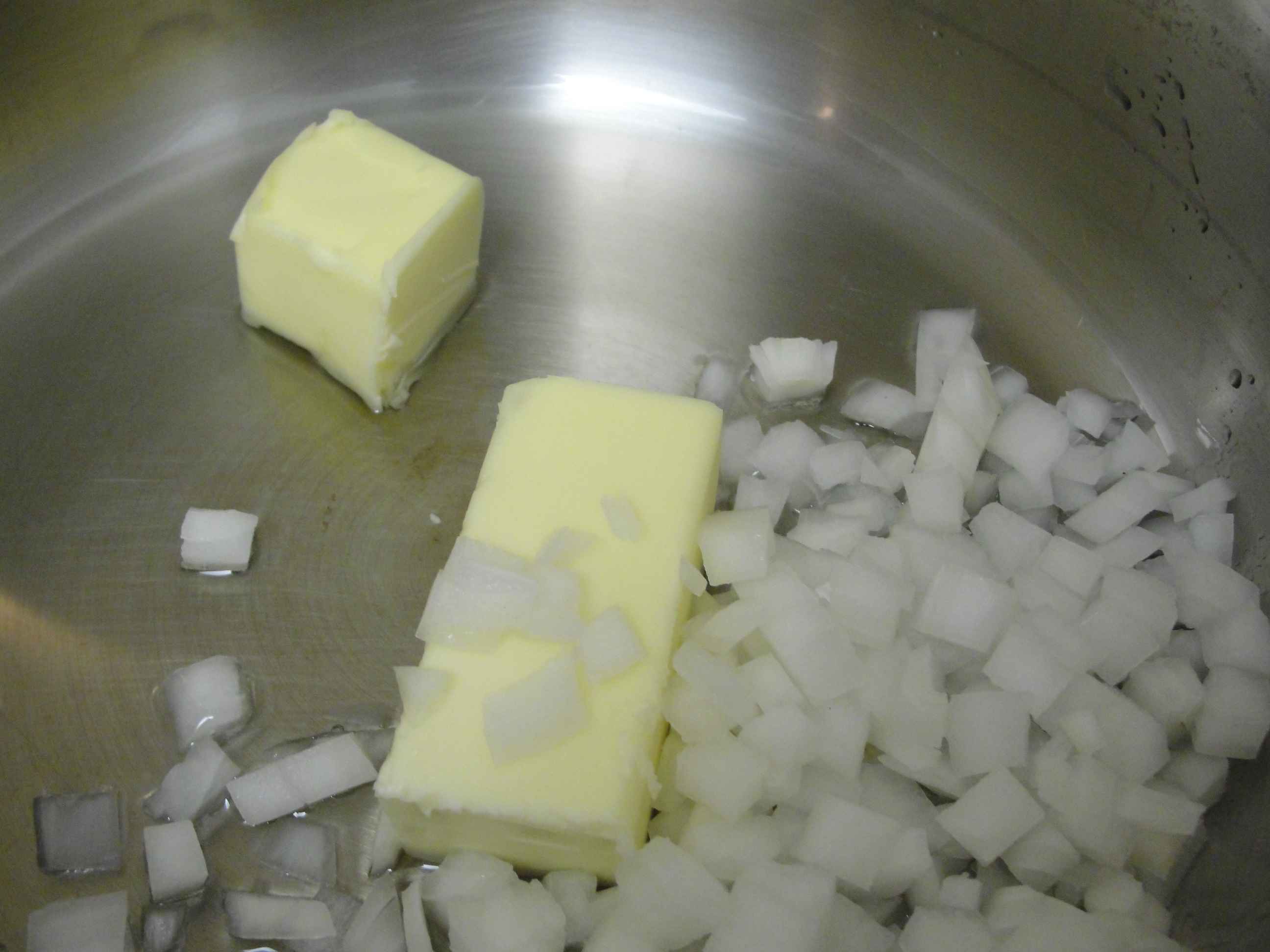 Heat 4 tbsp of butter and then add the diced onion and cook until golden brown.