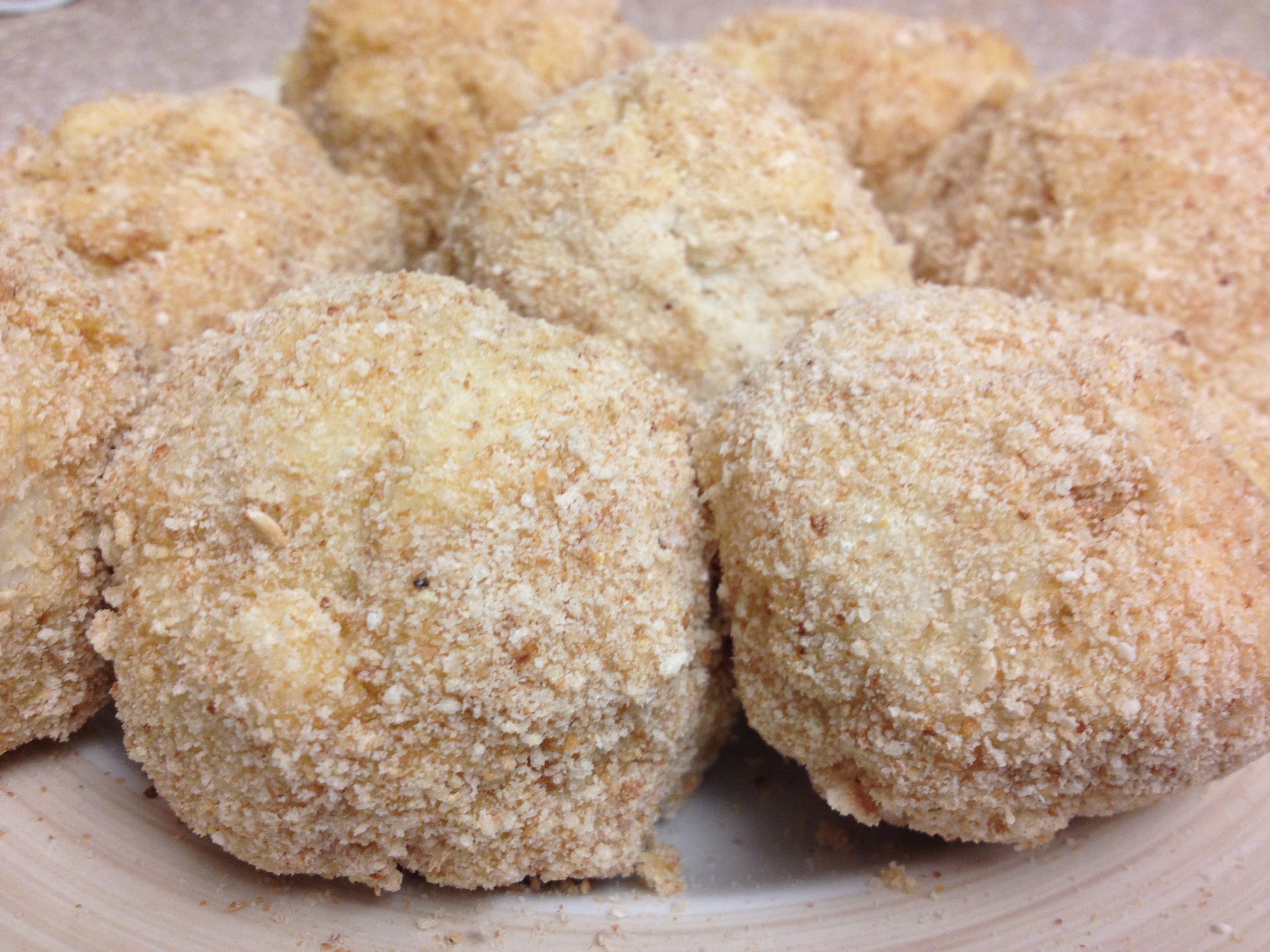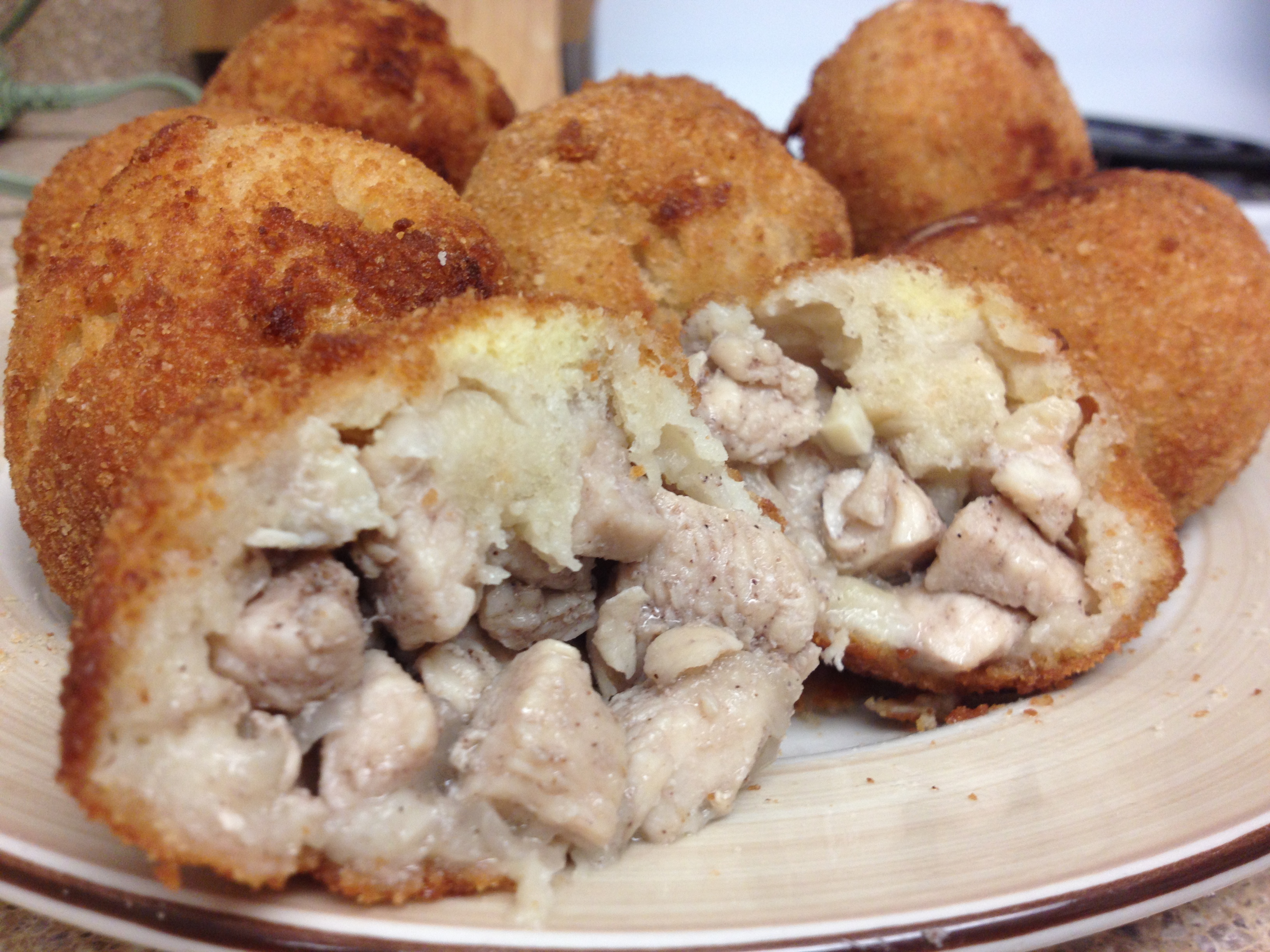 Remove the skins of the bread and wet it with milk then wrap around one tablespoon of the chicken in a ball. Repeat until all the chicken is used. (I use water instead of milk for mine since I am lactose intolerant)