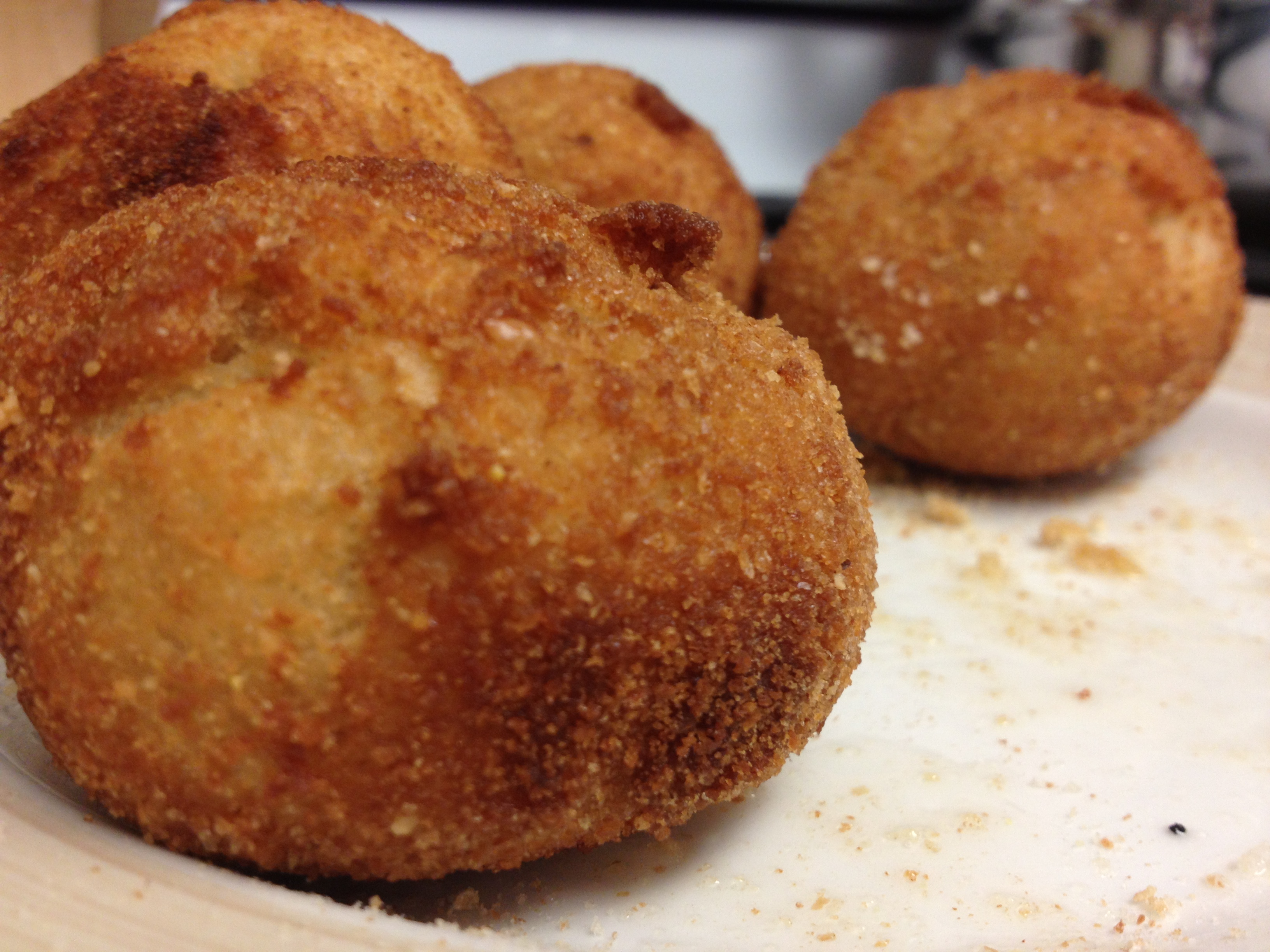 Beat one egg then roll the chicken/bread ball in the egg batter until all sides are covered then roll it in the bread crumbs.