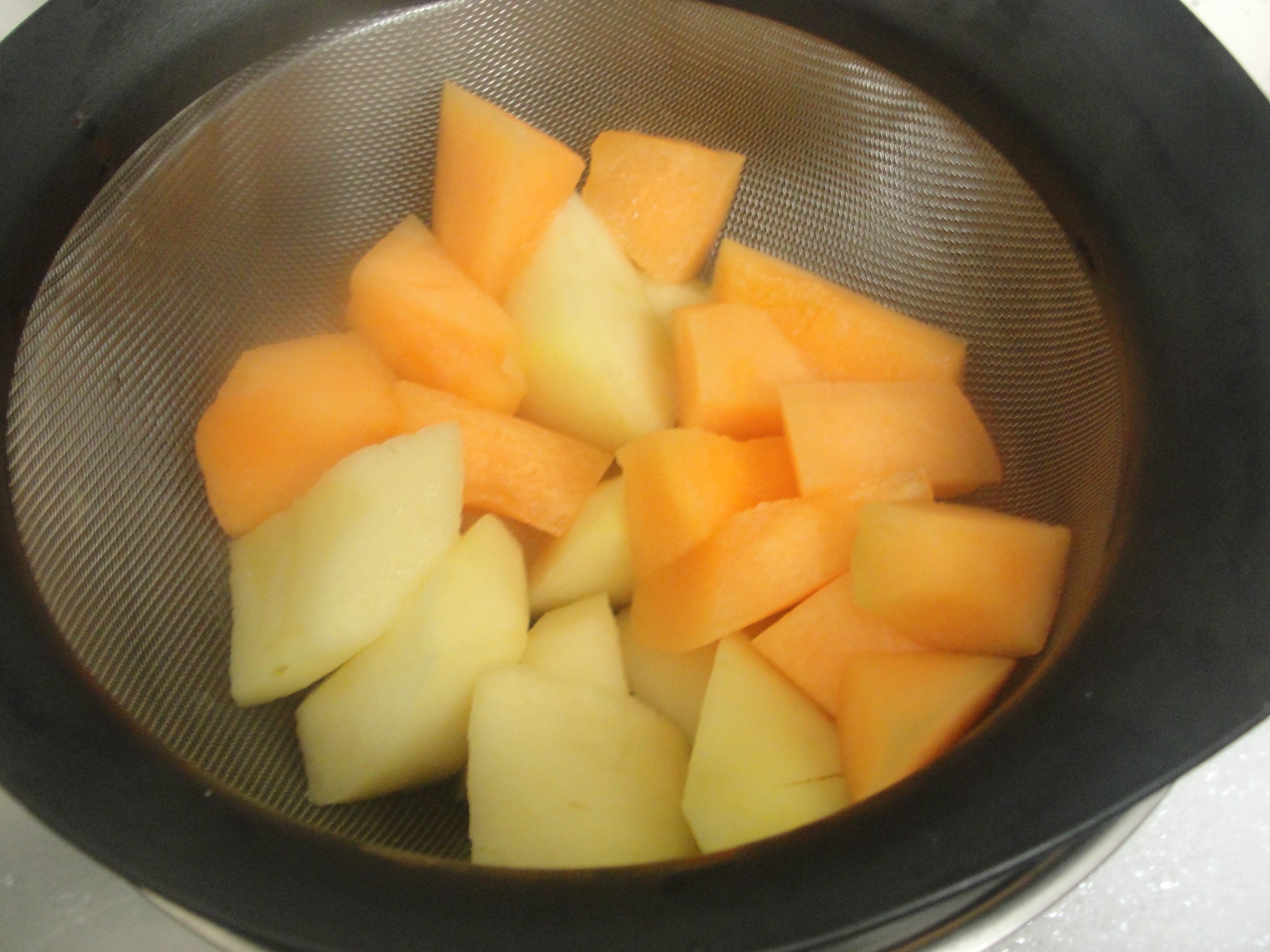 Boil the hard fruits (apple and cantaloupe) until soft.