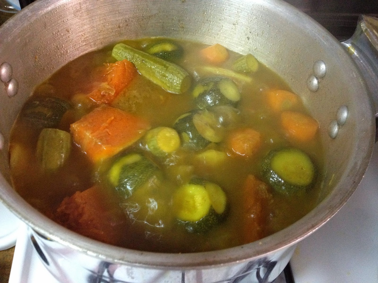 Add Potatoes, zucchini, pumpkin pieces, beef stock cube, one cup of hot water, then cover the pot and cook for 14 minutes.